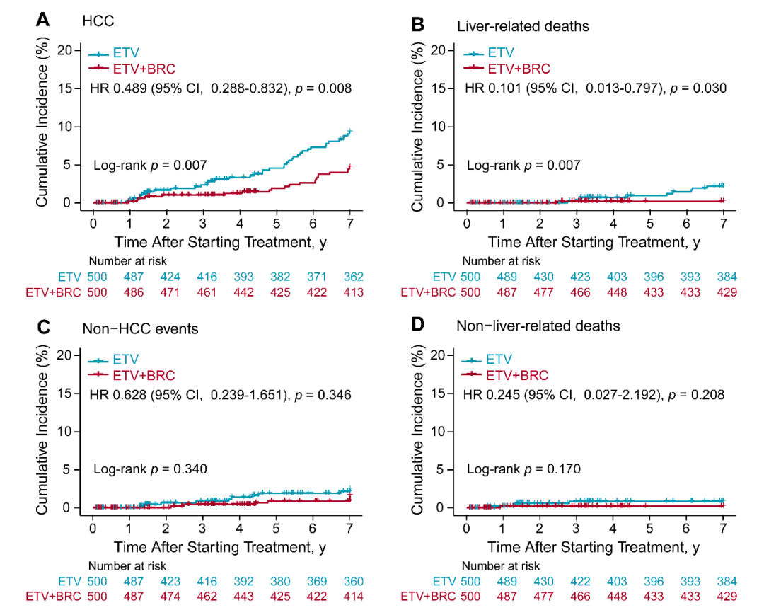 图1. ETV+BRC组与ETV单药组7年累积(非)肝癌发生率和(非)肝脏相关死亡率比较