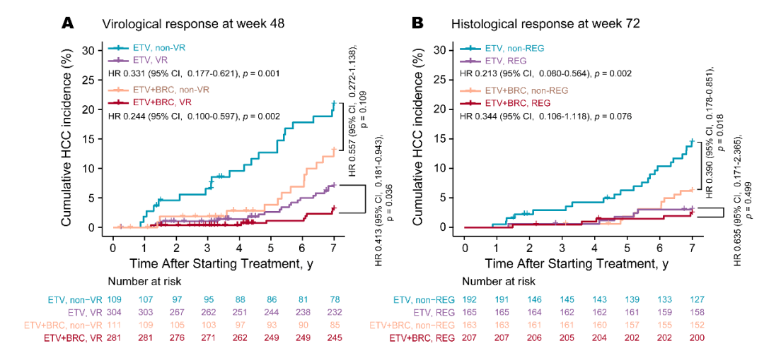 图2. ETV+BRC组与ETV单药组48周病毒学应答、72周组织学应答与肝癌累积发生率的相关性